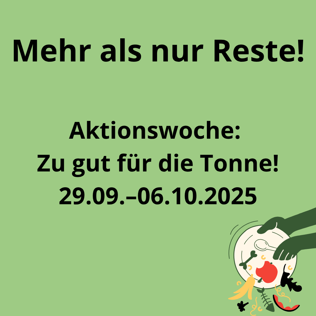 Vom 29.09.-06.10. läuft die bundesweite Aktionswoche „Zu gut für die Tonne!“ . Die Woche lädt Bürger*innen, Schulen, Gastronomie, Handel und Verwaltung ein, praktische Schritte gegen Verschwendung zu erproben.